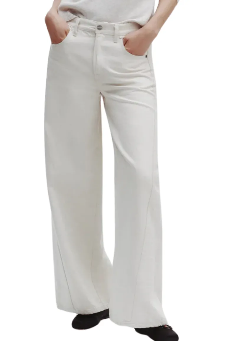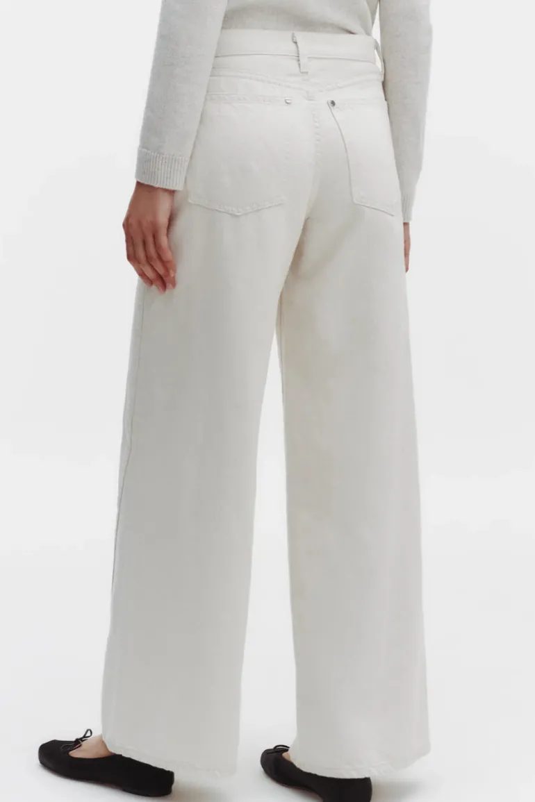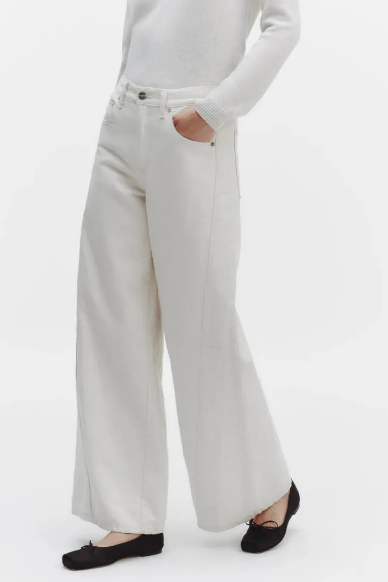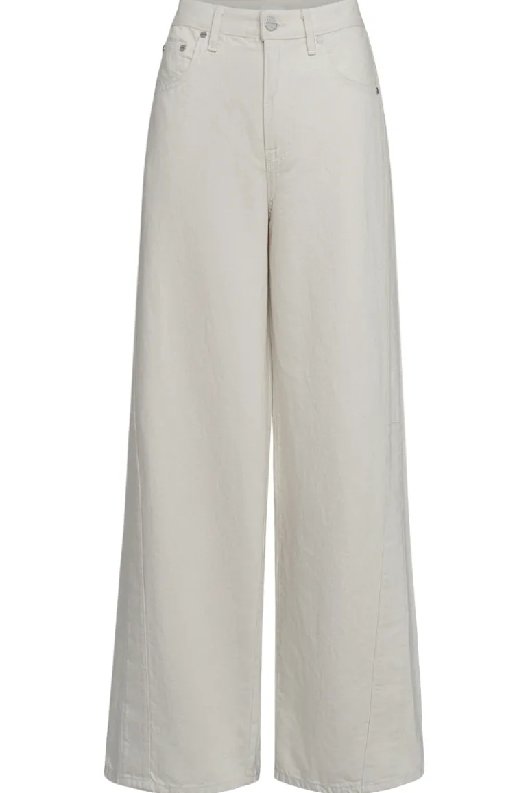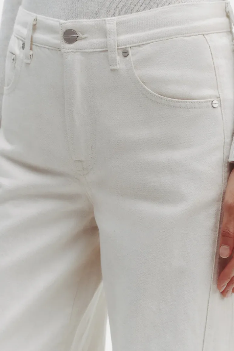 Mid-rise, wide leg jeans in cotton linen denim, manufactured in LA. The Almost Famous Jean is a relaxed fit with a tux stripe down the side of each leg. Complete with a five pocket style, accented with metal rivet hardware, a zip fly, belt loops and metal shank at the waistband.