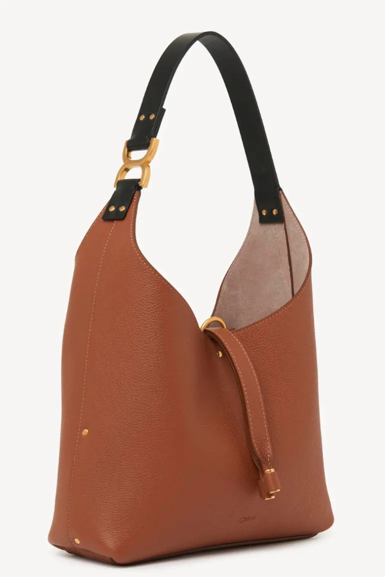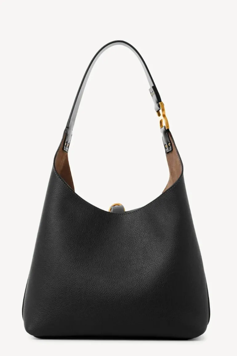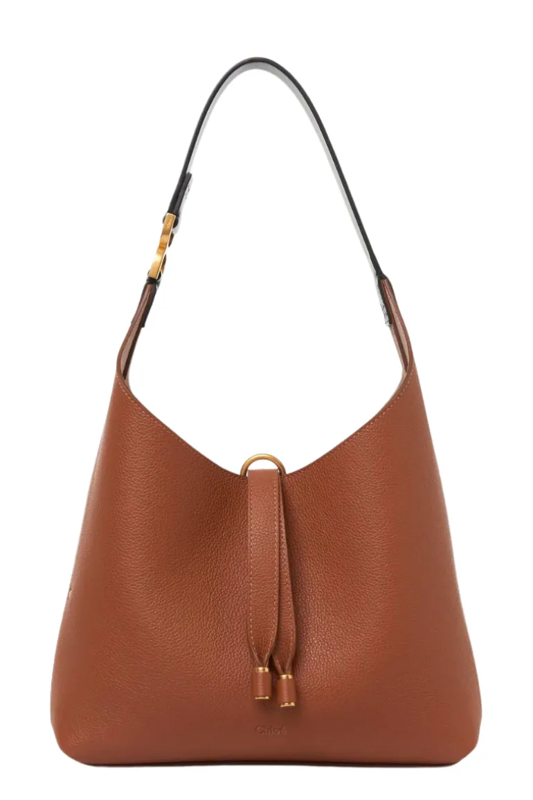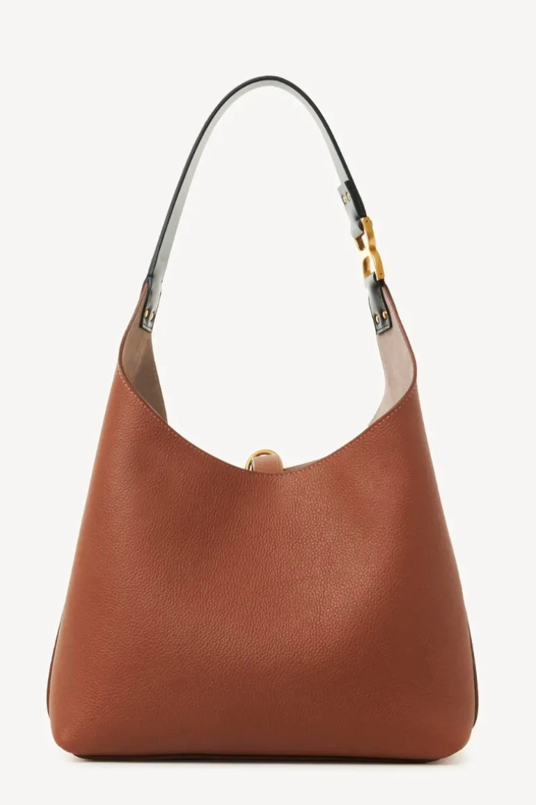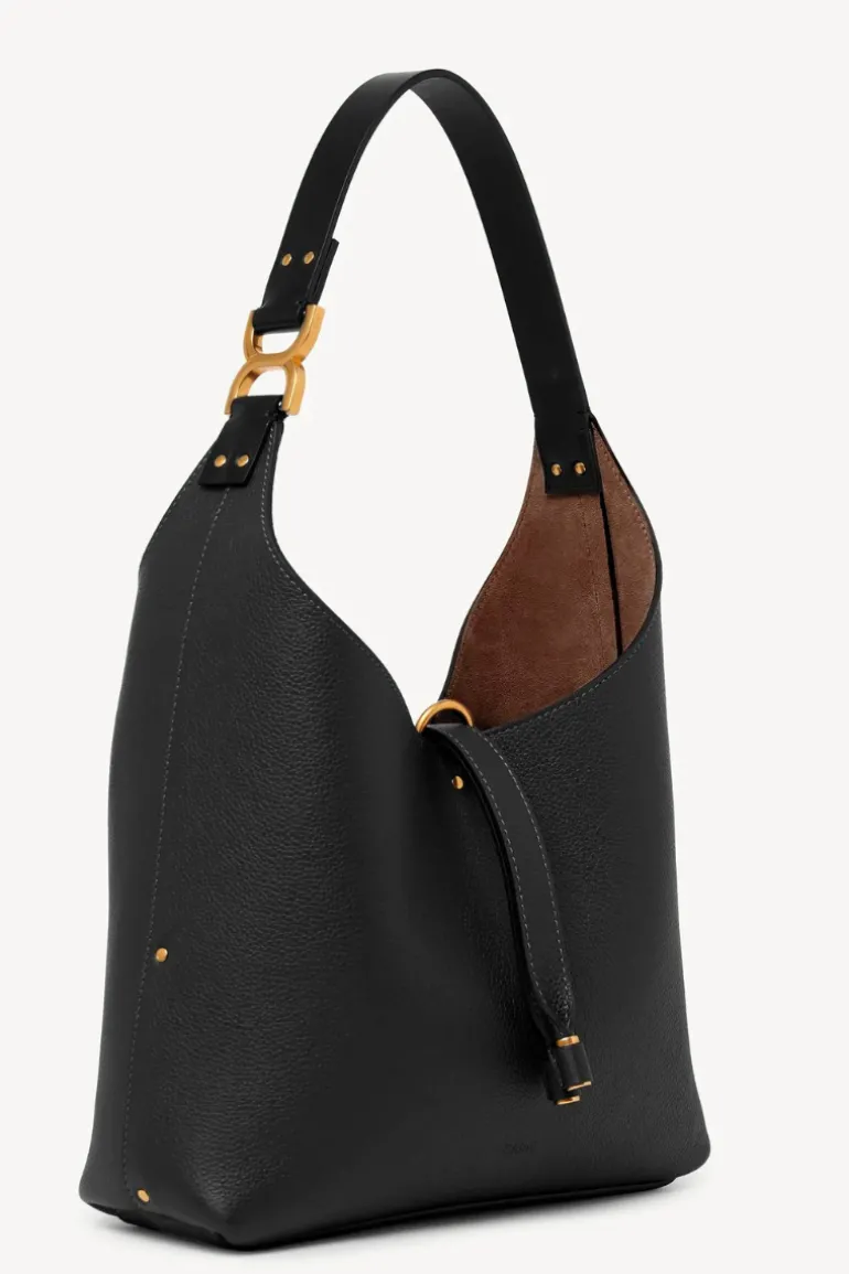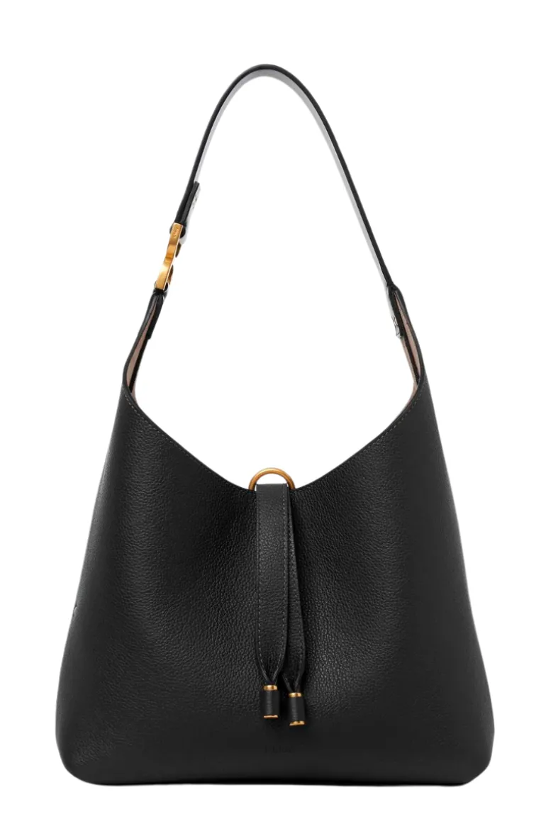 This small Marcie hobo bag has a slouchy, minimalist silhouette. Crafted from grained calfskin, it features a contrasting studded handle embellished with the line’s iconic gold-tone metallic piece. Signature leather tassels secure its suede calfskin interior.