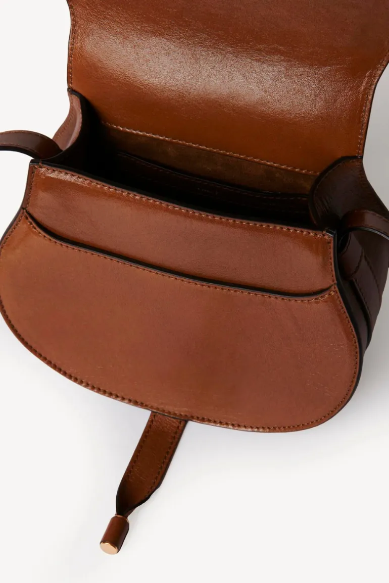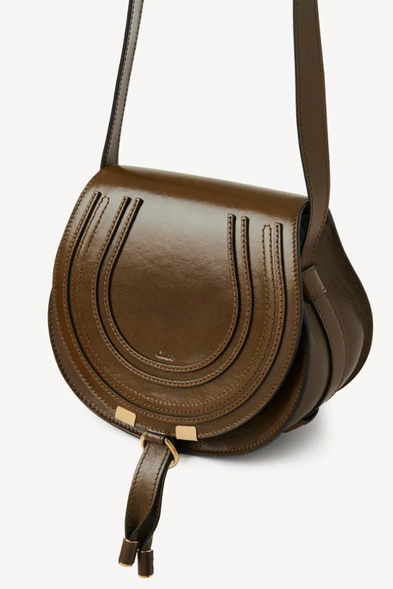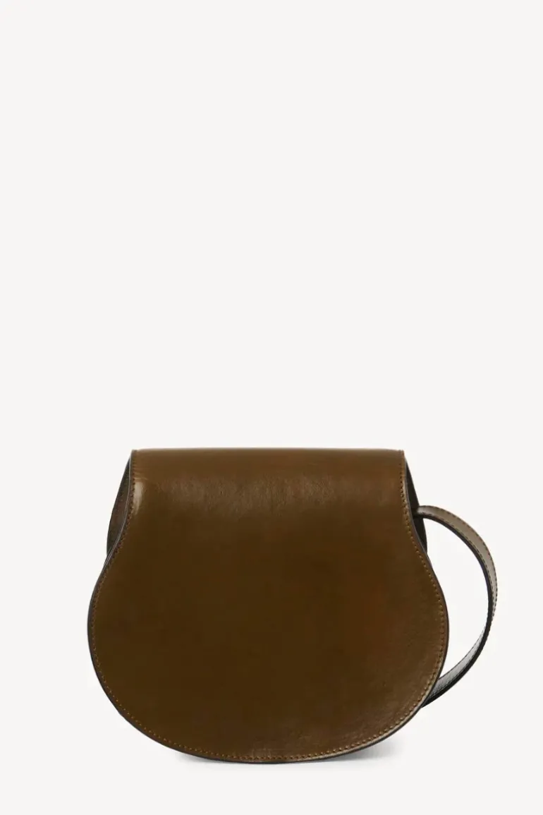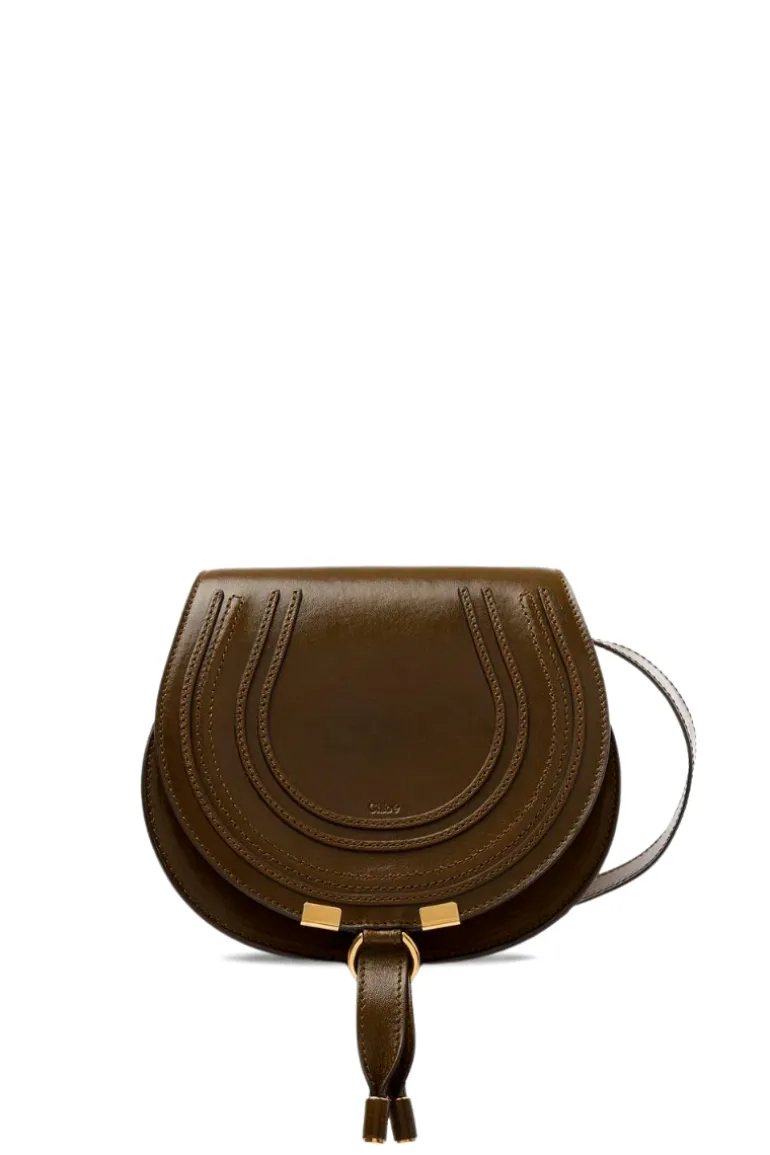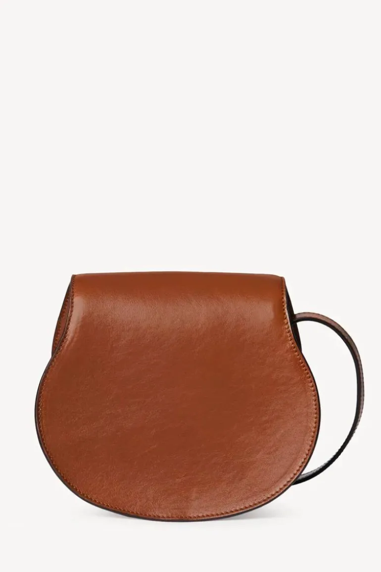 This small Marcie saddle bag is crafted from shiny calfskin with a rounded silhouette and a clean top line. The flap features the line’s iconic saddle stitching, secured with signature dangling leather tassels.