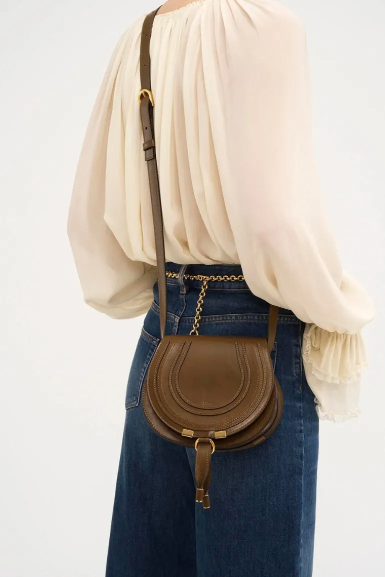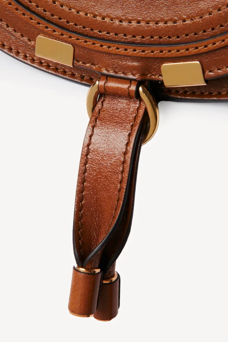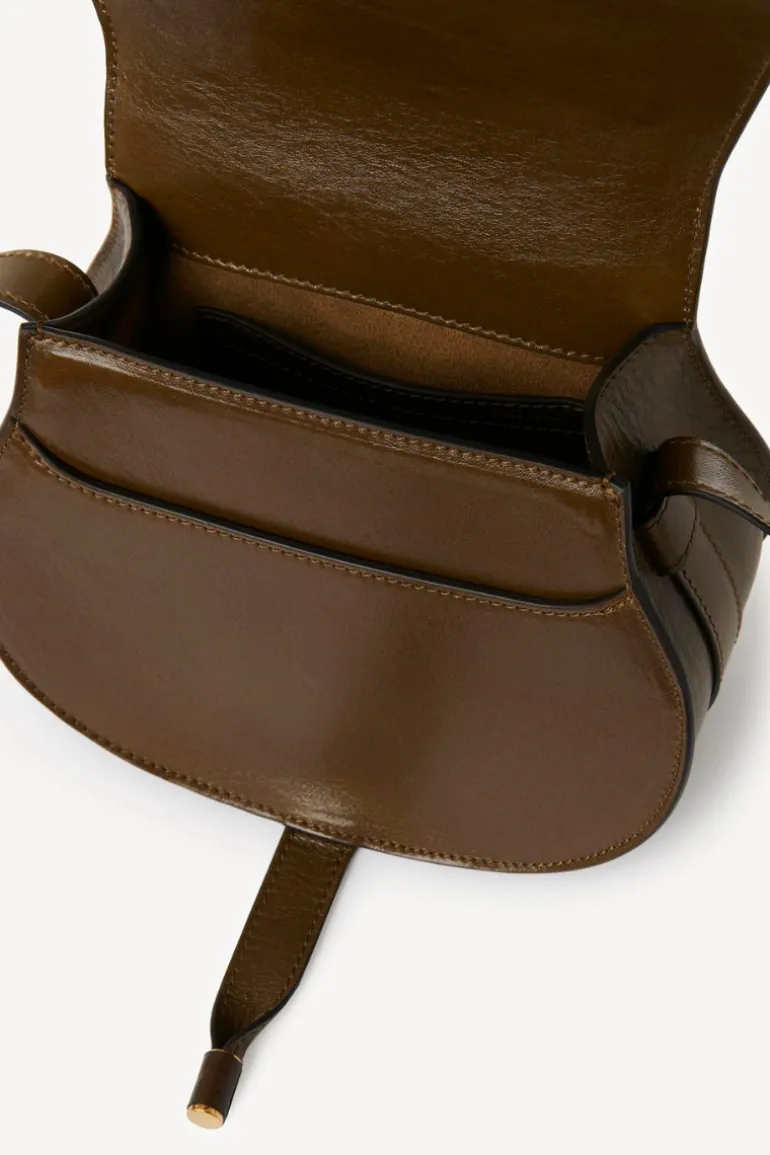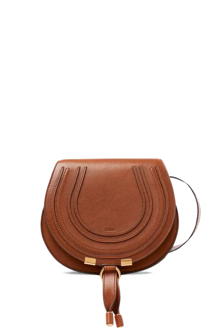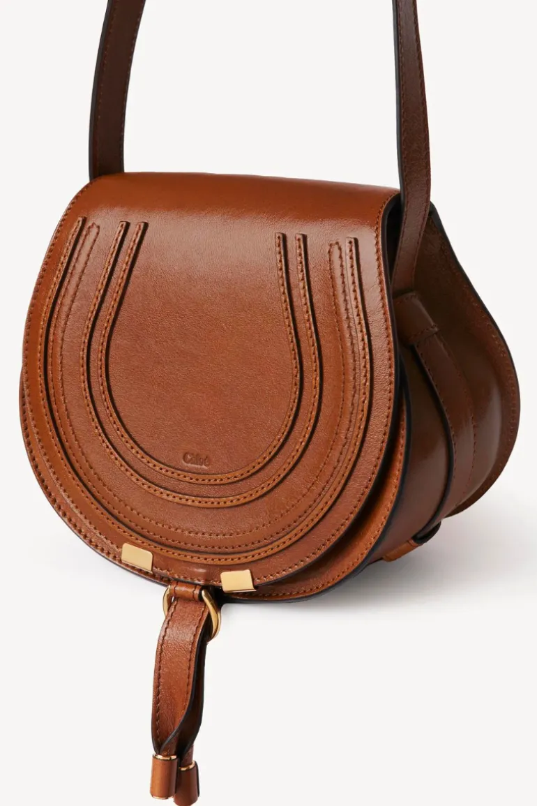 This small Marcie saddle bag is crafted from shiny calfskin with a rounded silhouette and a clean top line. The flap features the line’s iconic saddle stitching, secured with signature dangling leather tassels.